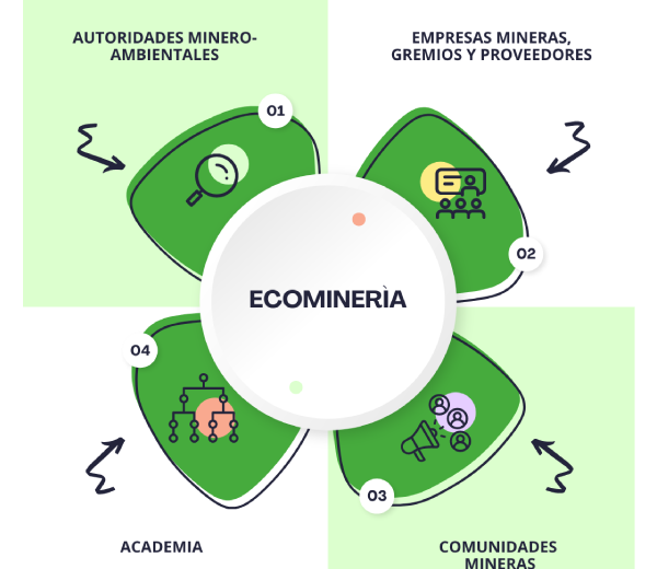 Para cada componente del Ecosistema Minero, se formulan proyectos y productos específicos. Así para las comunidades, se tiene: un protocolo de incersión comunitaria concertada del proyecto minero, un compendio de minas exitosas y una agenda didáctica intinerante.